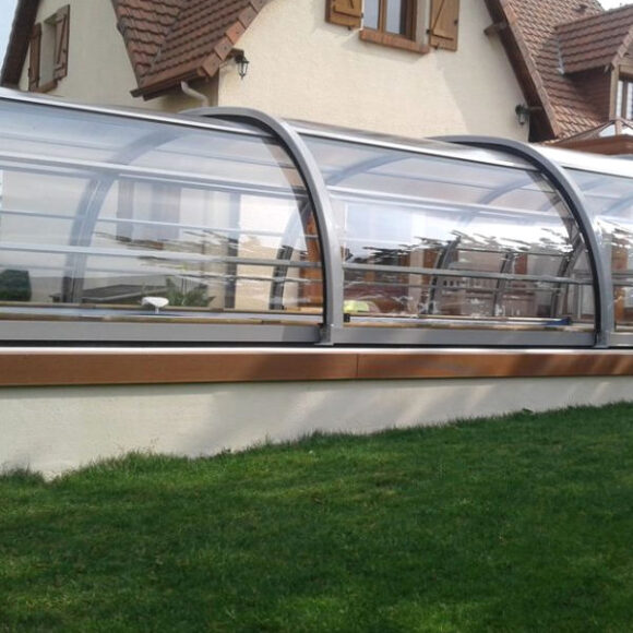 L’abri de piscine « Le 180 » possède des lignes fluides et douces, sans usinage apparent.